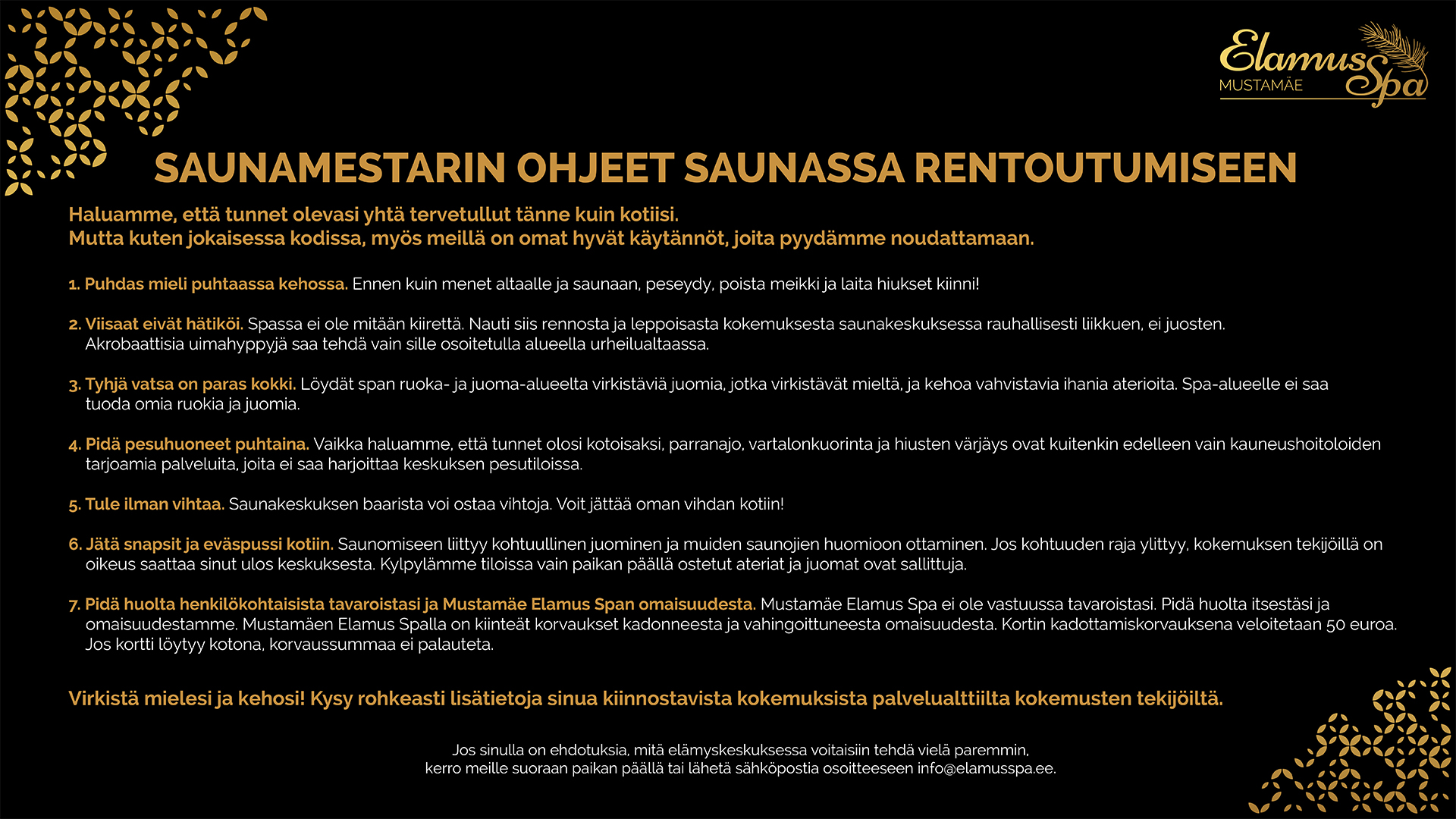 Mustamäe Elamus Spa ei ole vastuussa tavaroistasi. Pidä huolta itsestäsi ja omaisuudestamme. Mustamäen Elamus Spalla on kiinteät korvaukset kadonneesta ja vahingoittuneesta omaisuudesta. Kortin kadottamiskorvauksena veloitetaan 50 euroa. Jos kortti löytyy kotona, korvaussummaa ei palauteta.