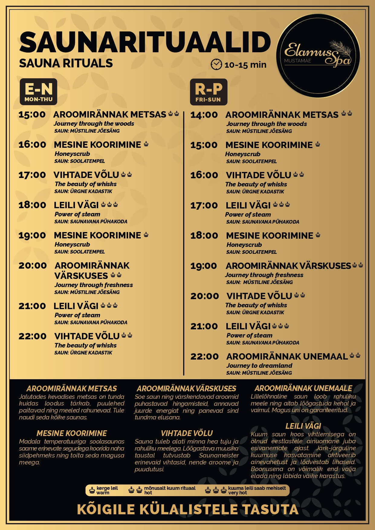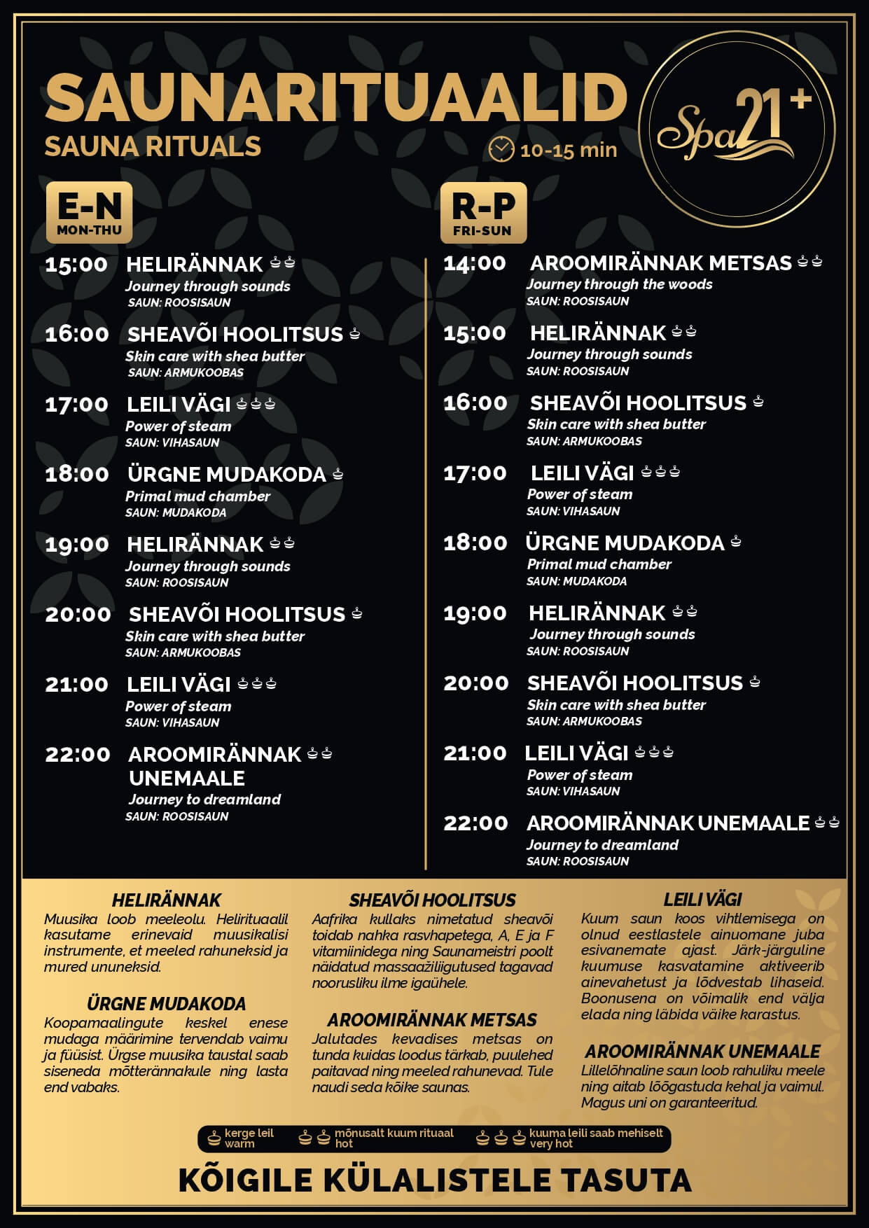 Sauna tuleb alati minna hea tuju ja rahuliku meelega. Lõõgastava muusika tausta taustal tutvustab saunameister erinevaid vihtasid, nende aroome ja puudutusi.